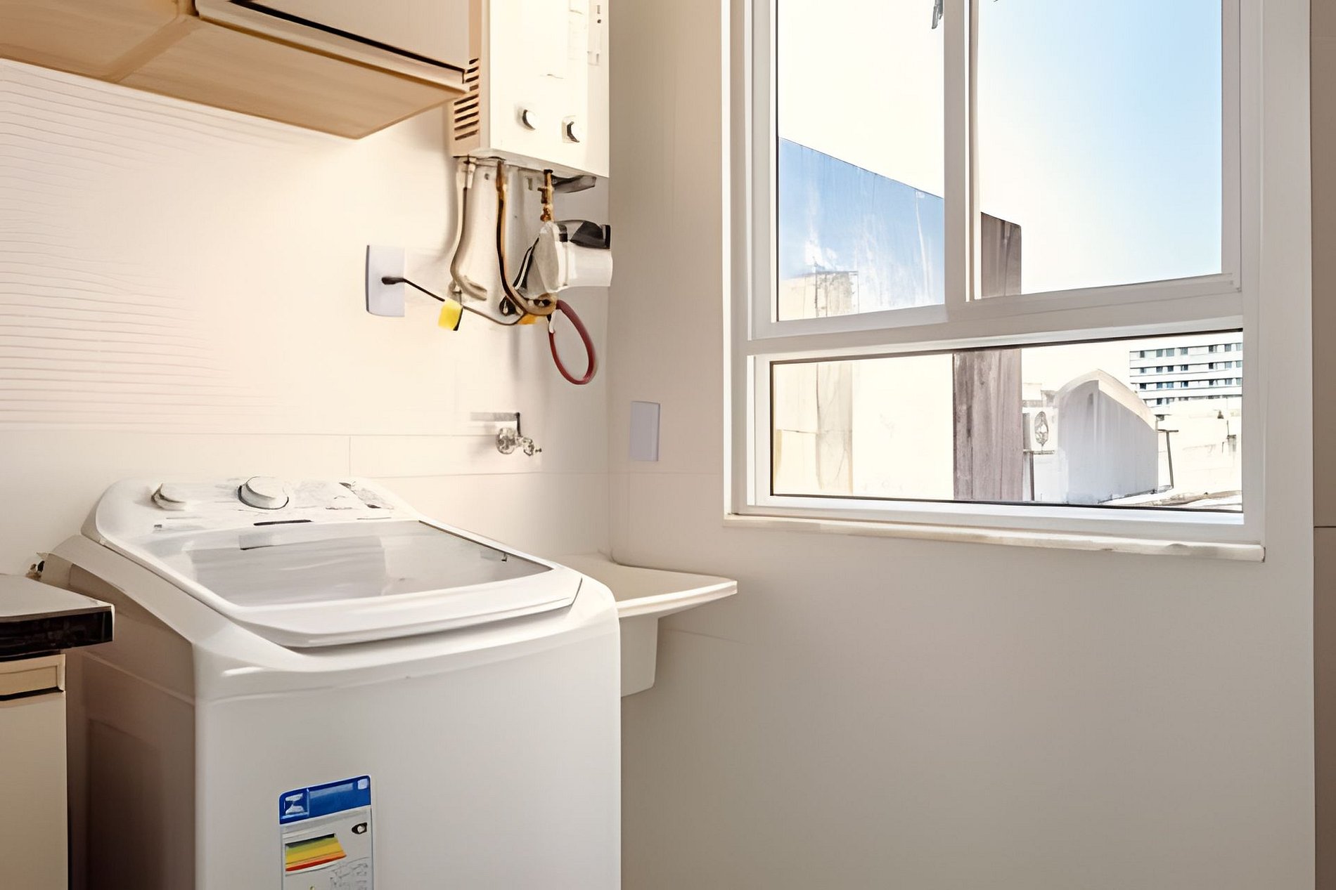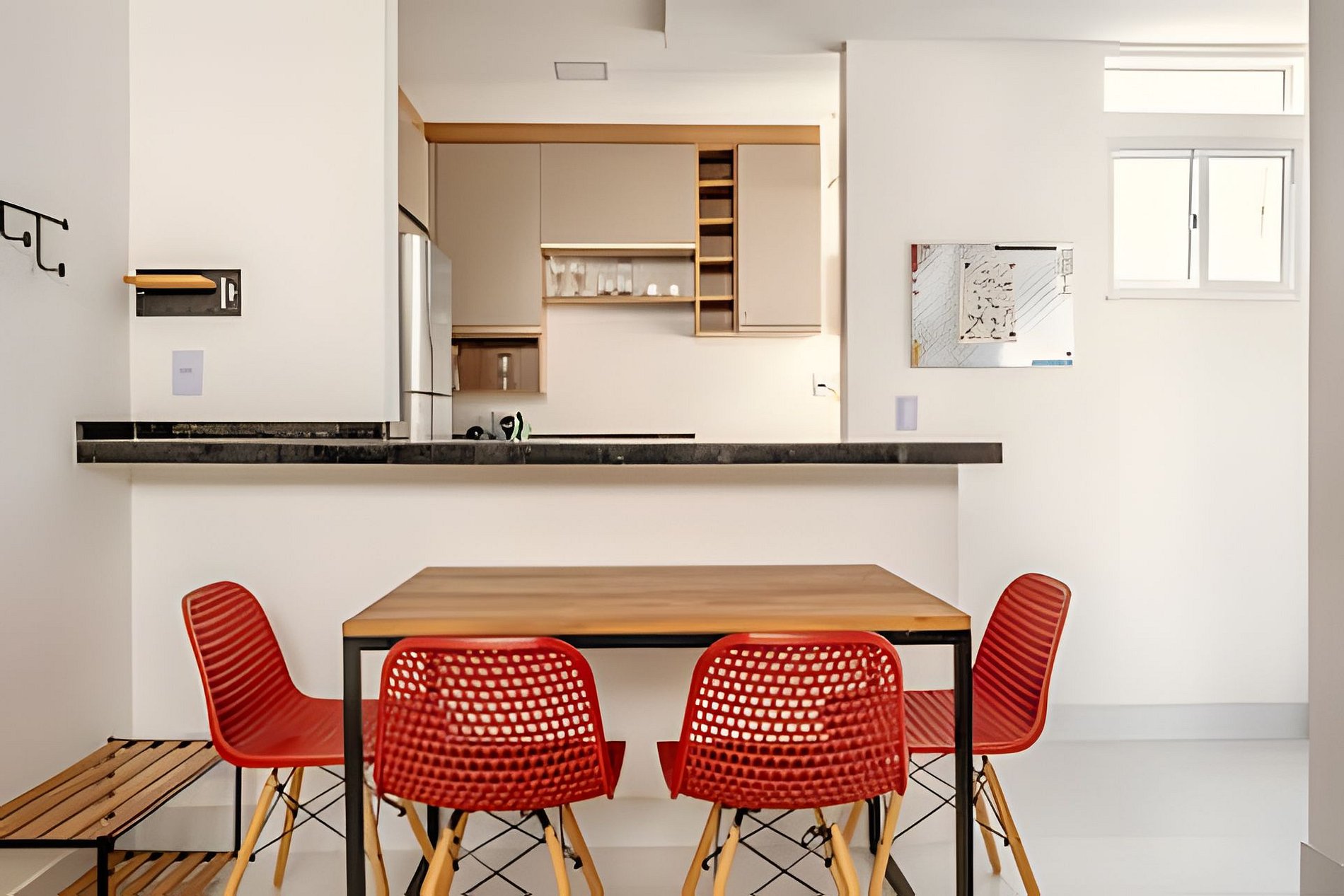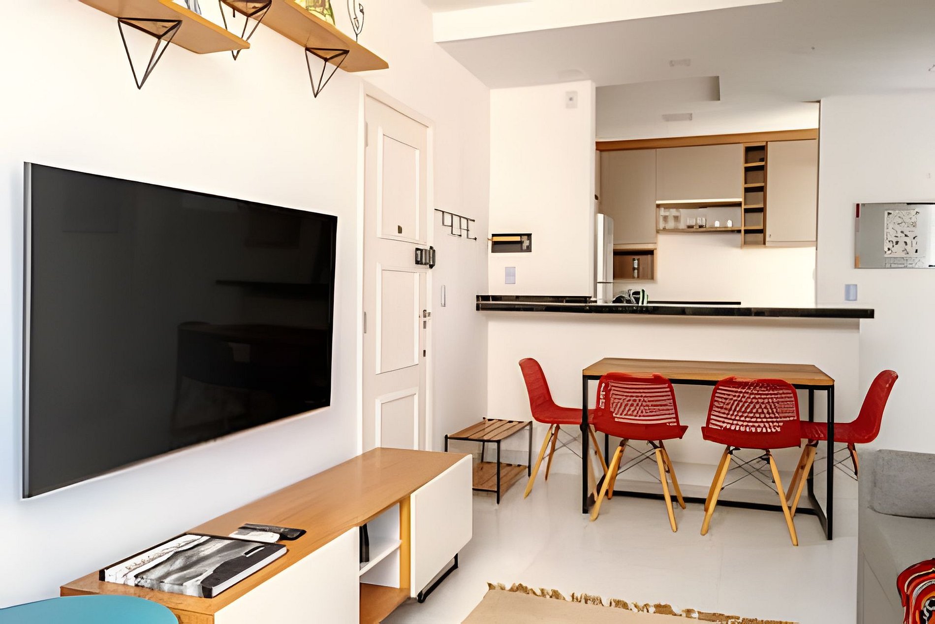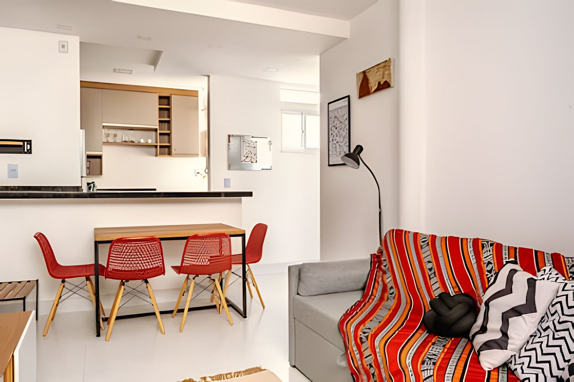 O espaço acomoda confortavelmente 4 pessoas em uma cama queen no quarto e um sofá-cama na sala. A cozinha está equipada com geladeira, cooktop, air fryer, cafeteira Nespresso, filtro de água, além de pratos, copos, panelas e demais utensílios necessários para o preparo das refeições. A área de serviço ainda dispõe de máquina de lavar e ferro de passar.