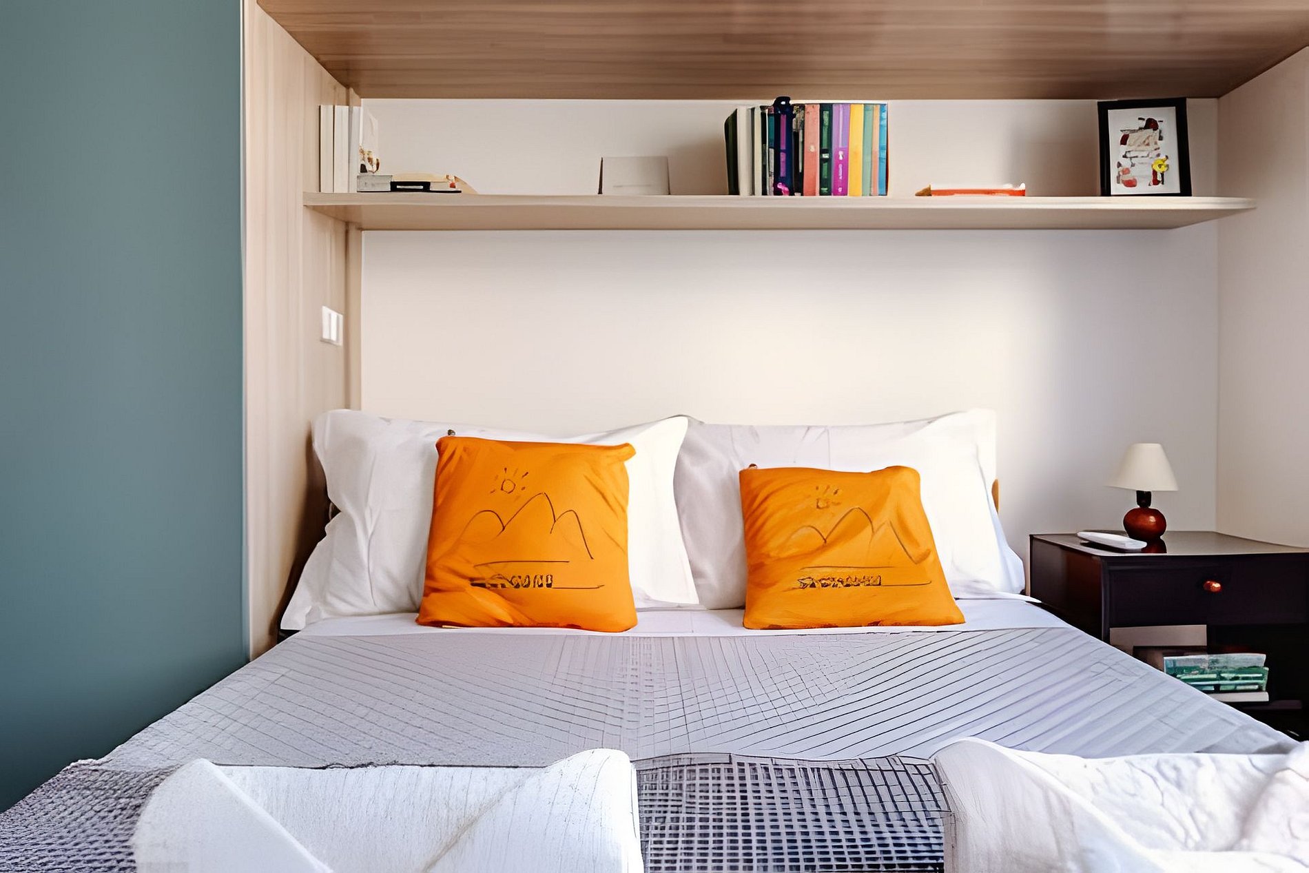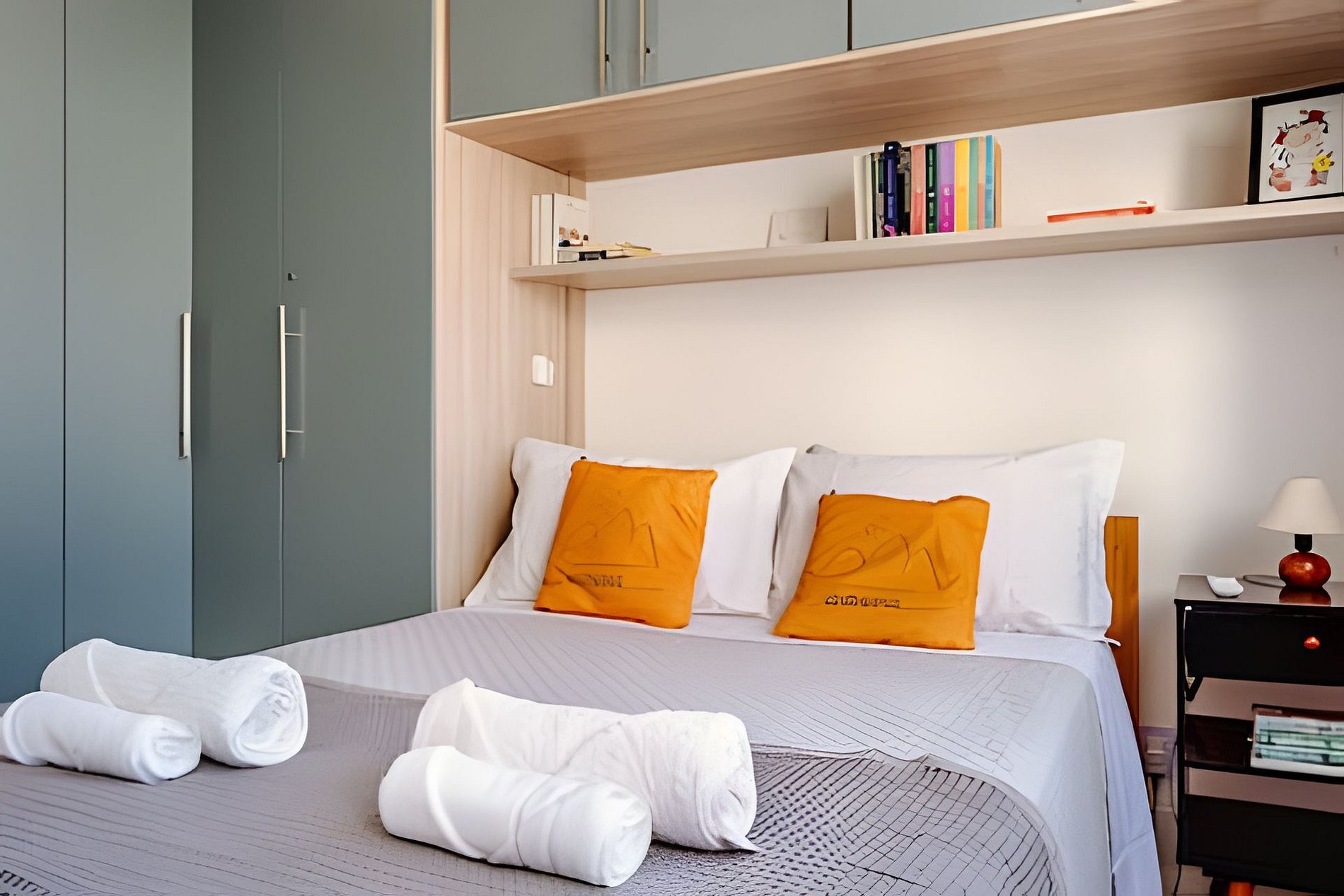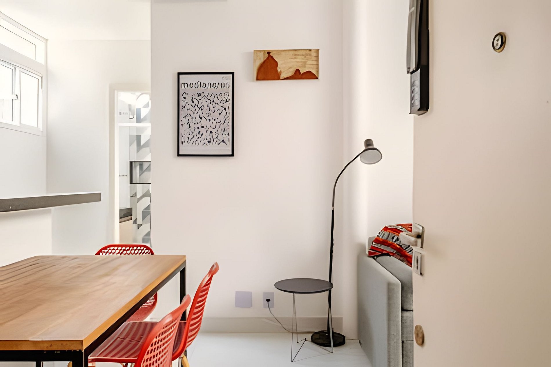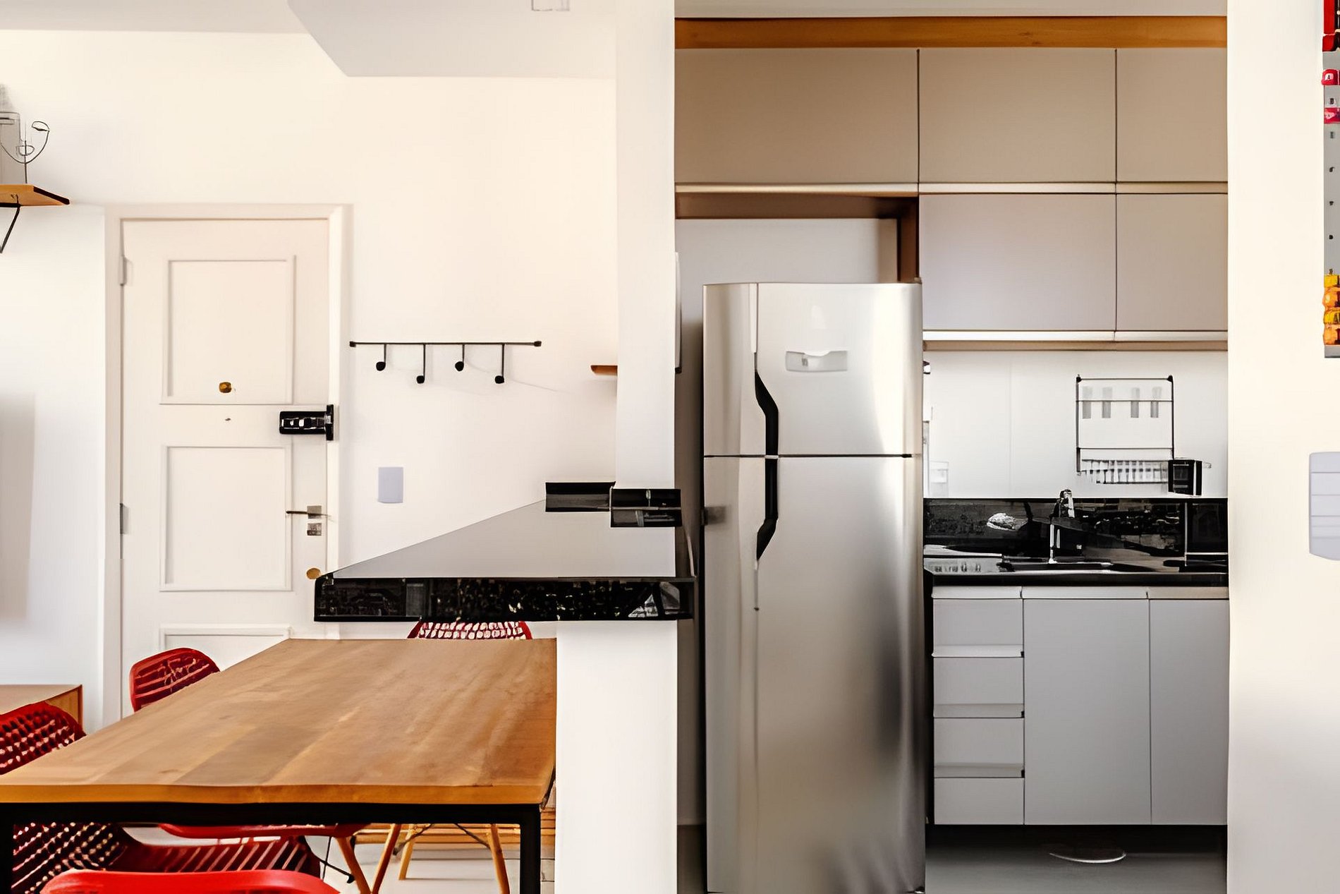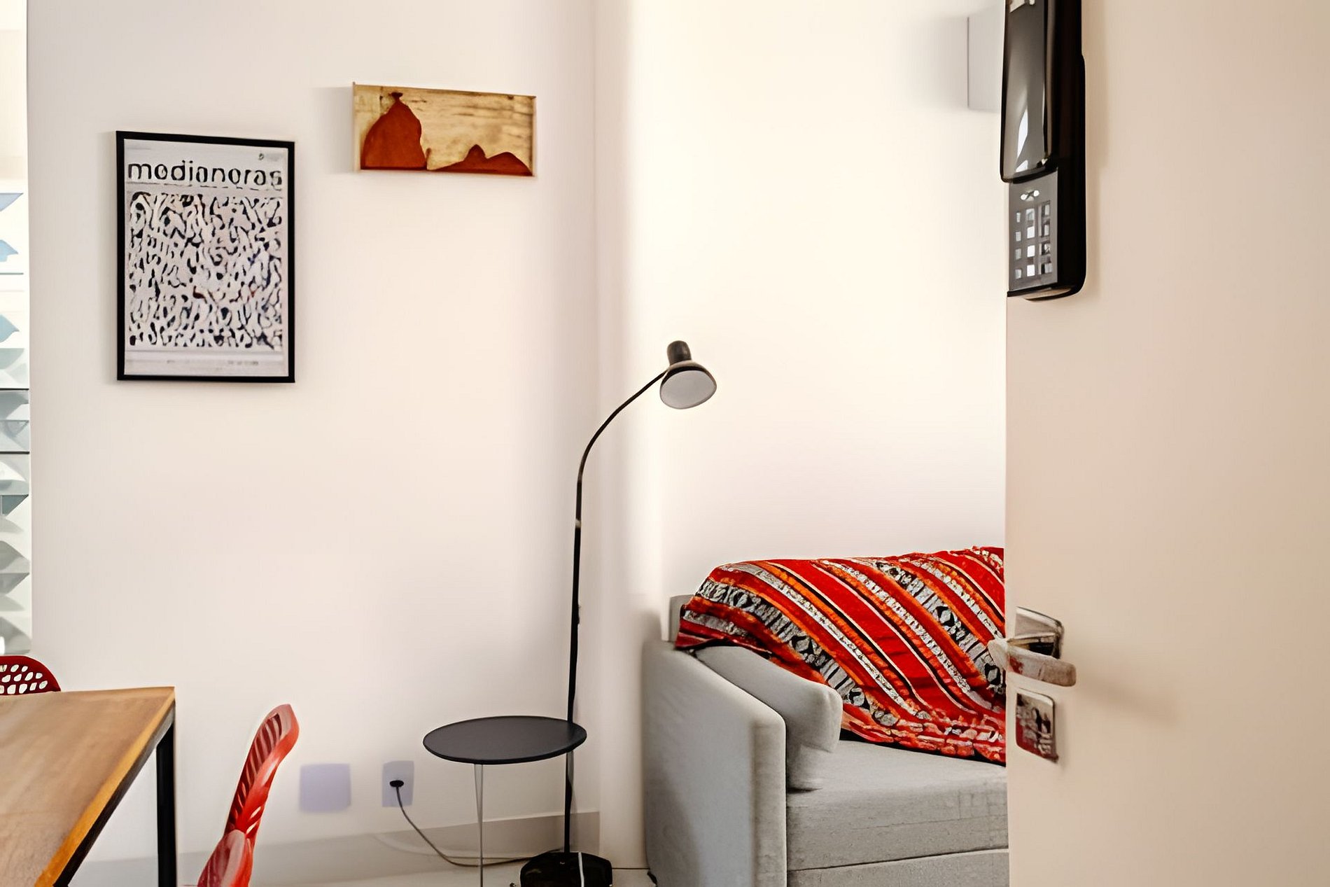 O espaço acomoda confortavelmente 4 pessoas em uma cama queen no quarto e um sofá-cama na sala. A cozinha está equipada com geladeira, cooktop, air fryer, cafeteira Nespresso, filtro de água, além de pratos, copos, panelas e demais utensílios necessários para o preparo das refeições. A área de serviço ainda dispõe de máquina de lavar e ferro de passar.