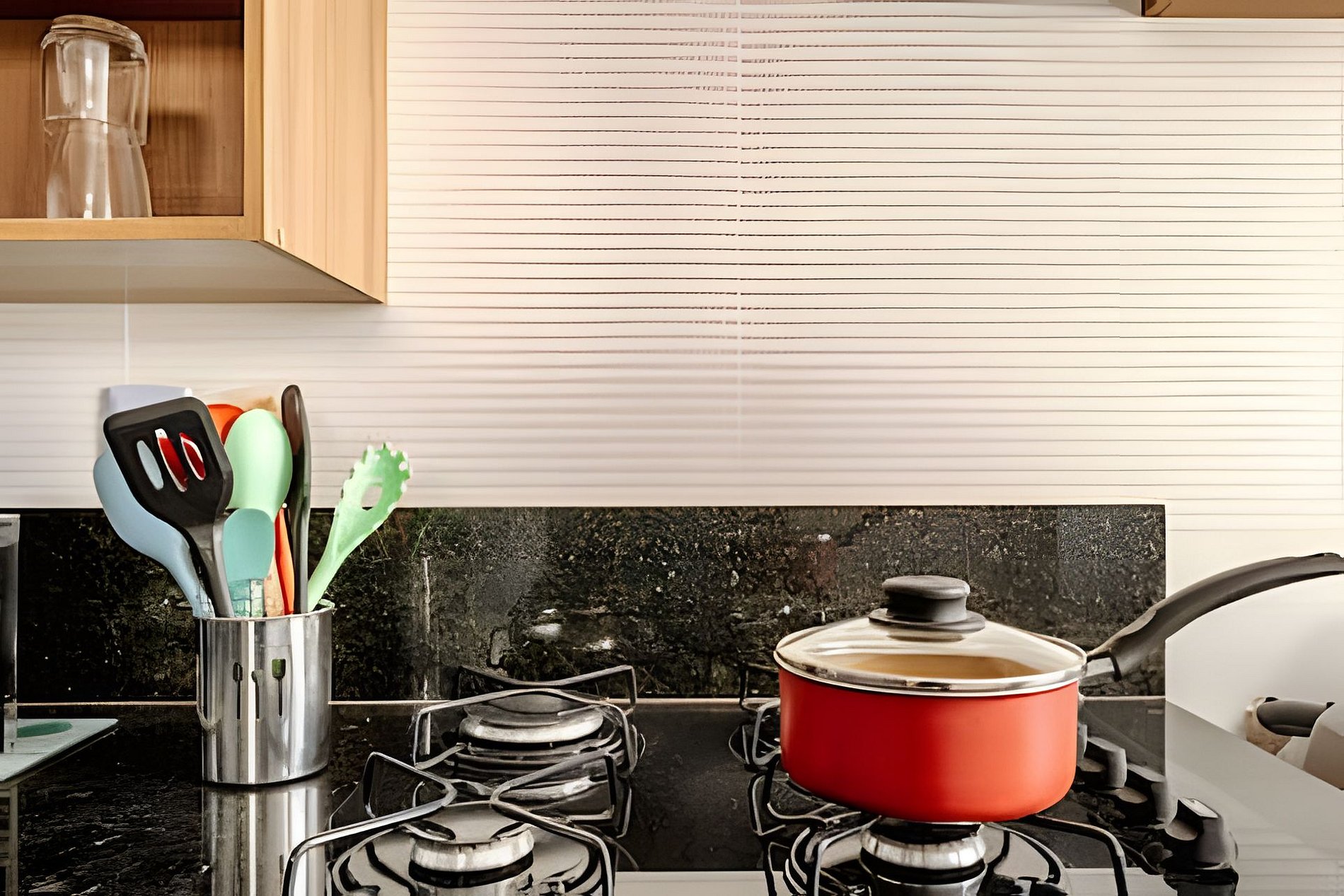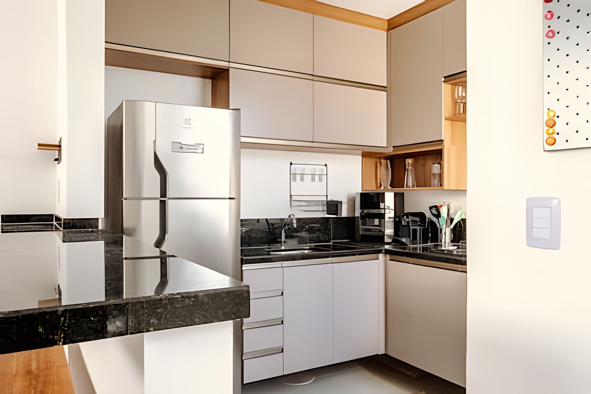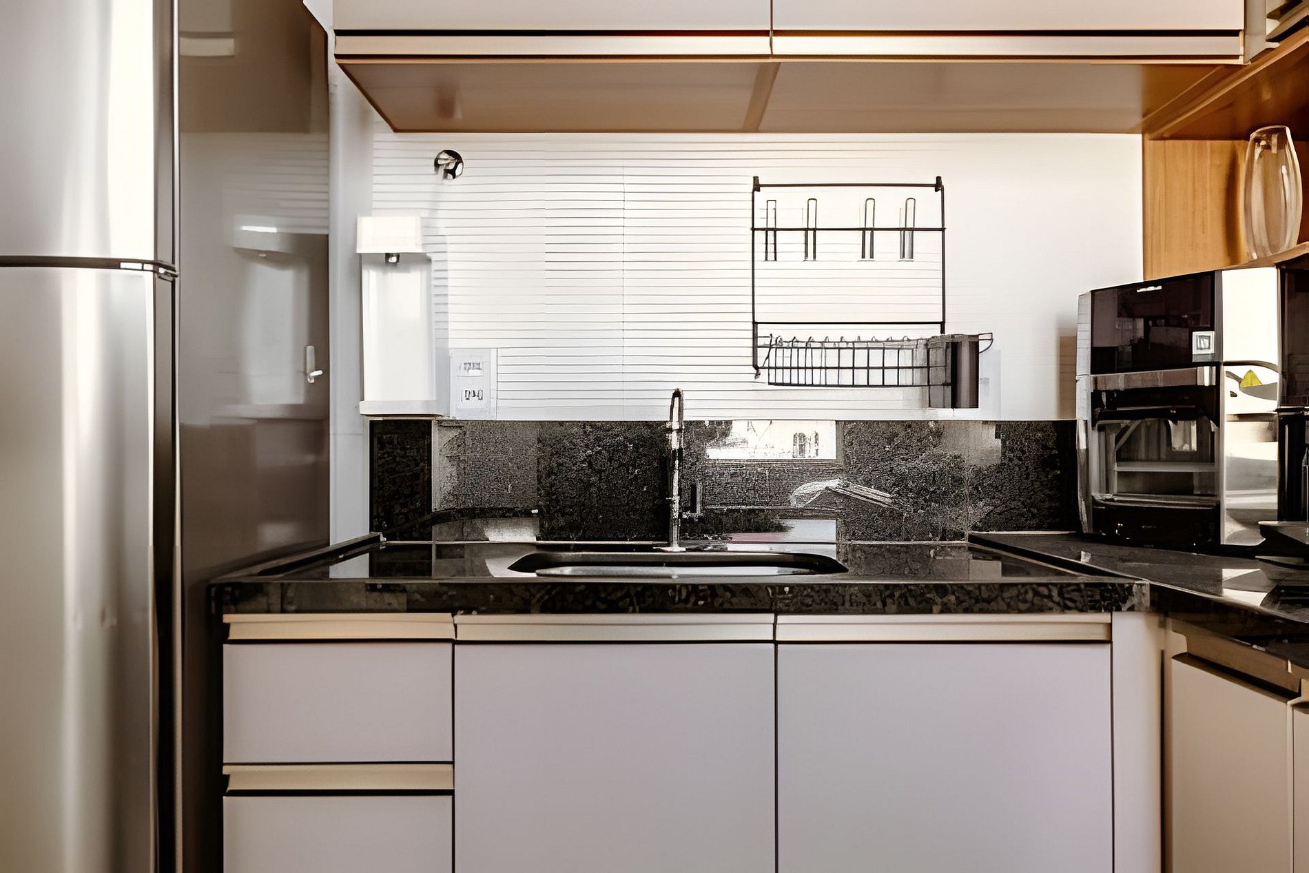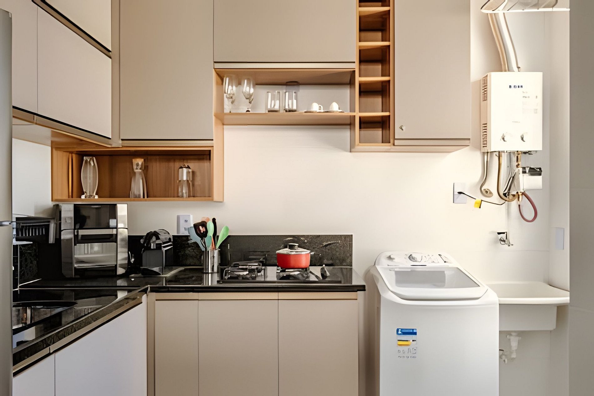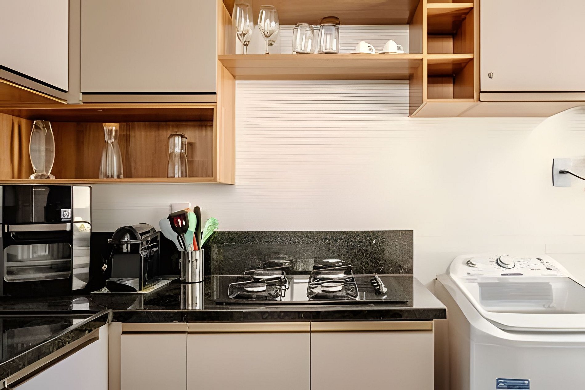 » Cozinha equipada com filtro de água, Nespresso, pratos, talheres, panelas, copos, taças e demais utensílios.